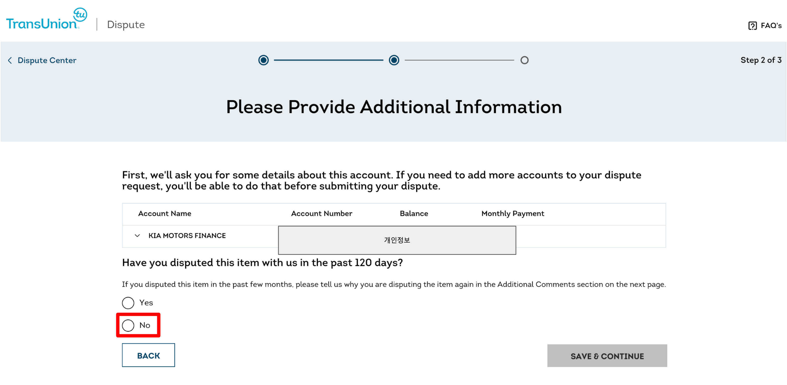 11. 처음으로 이의 제기 신청하는 경우, “해당 아이템을 120일 내로 TransUnion에게 이의 제기한 적 있습니까?”라는 질문에 “No”선택 후, “Save & Continue” 클릭