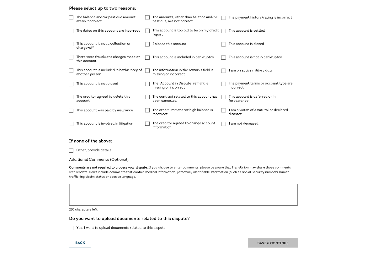 13. 해당되는 이유를 2개까지 고르거나 추가 코멘트를 적고, 첨부할 추가 서류가 있는 경우, “Yes, I want to upload documents related to this dispute” 선택 후, “Save & Continue” 클릭