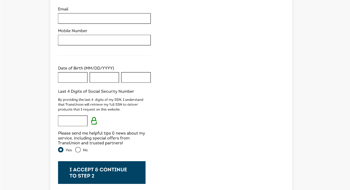 3. 이메일 주소, 핸드폰 번호, 생년월일 그리고 소셜 시큐리티 넘버 마지막 4개의 숫자 입력 후, “I accept & continue to step 2” 클릭
